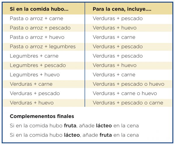 • Equilibra el día: Si en el cole han comido pasta, opta por proteína y verdura en la cena. Si han tenido pescado, quizá toque carne o legumbres… (ver cuadro inferior)